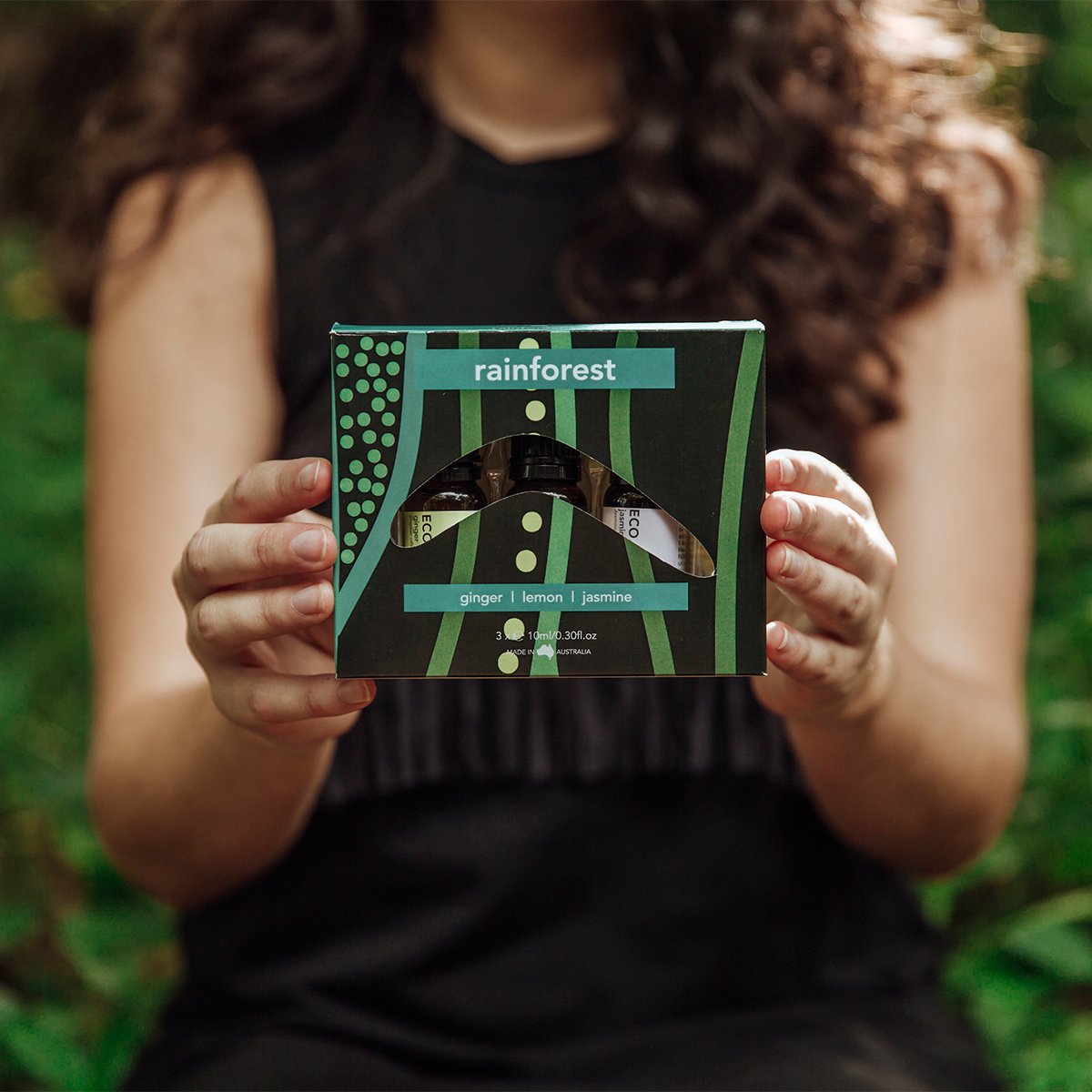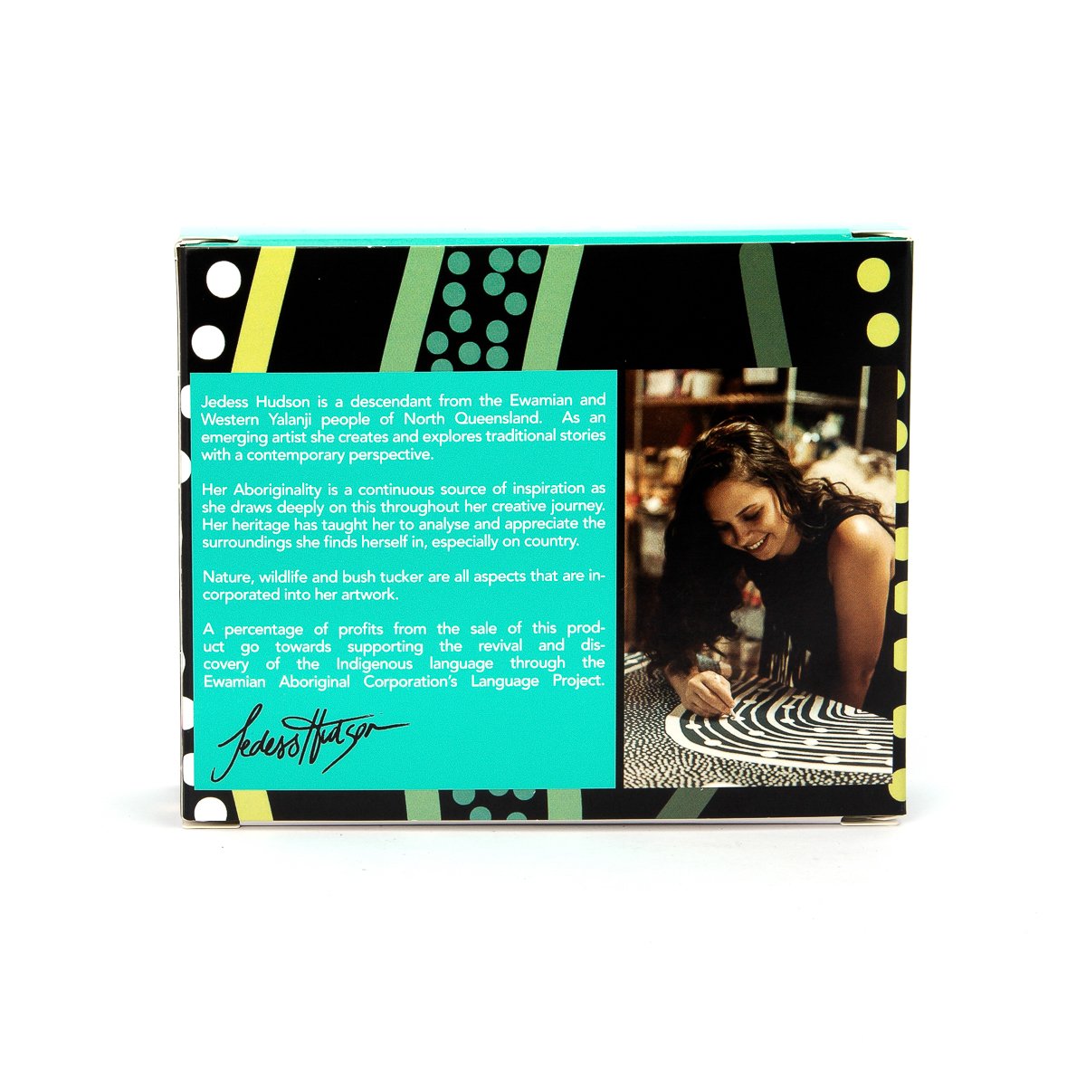 This Aroma trio pack features Indigenous artwork by Jedess Hudson. Jedess is a descendant from the Ewamian and Western Yalanji people of North Queensland. As an emerging artist she creates and explores traditional stories with a contemporary perspective. Her Aboriginality is a continuous source of inspiration as she draws deeply on this throughout her creative journey. Her heritage has taught her to analyse and appreciate the surroundings she finds herself in, especially on country. Nature, wildlife and bush tucker are all aspects that are incorporated into her artwork.
