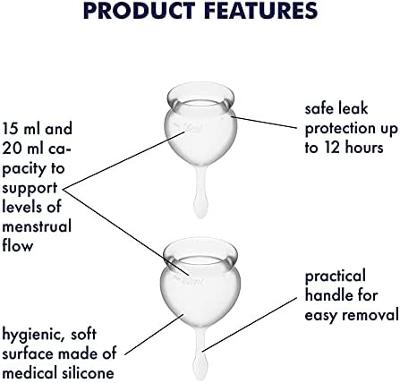 - Set of two menstrual cups; 15ml for lighter flow days and 20ml for heavier flow days