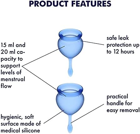 - Set of two menstrual cups; 15ml for lighter flow days and 20ml for heavier flow days