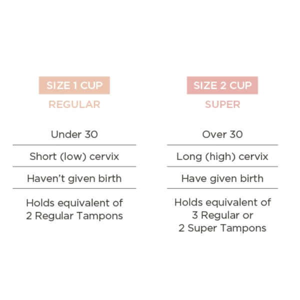 Size 1 (Regular): Recommended for people aged 30 years and under, and mostly for those who have not given birth. Suitable for a light to medium flow and holds the equivalent of 2 regular tampons (22ml).