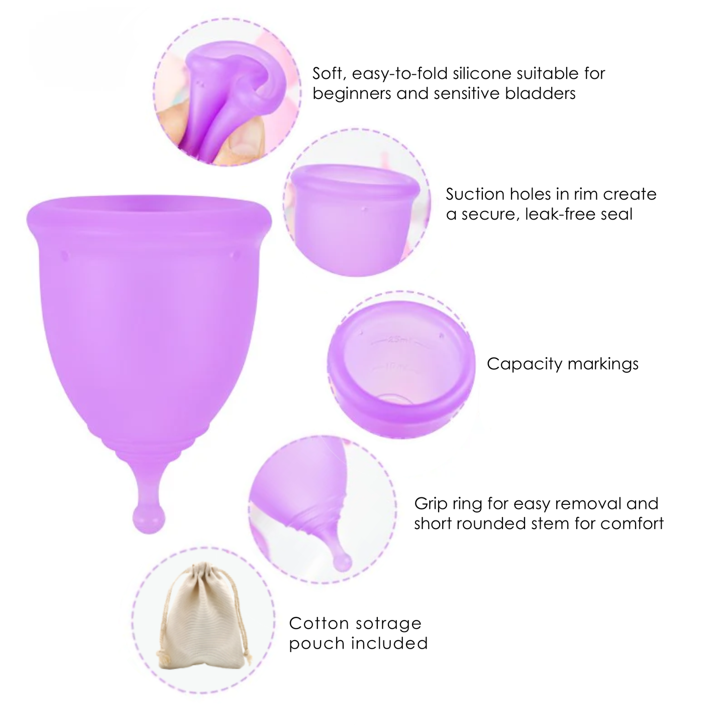 It features a seam-free, classic bell-shaped design with a short nib stem for comfort. Holes in the rim assist with creating a firm seal for a leak-free period and grip rings at the base of the cup assist with removal.